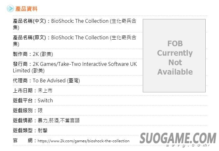在台湾游戏分级网站的页面中出现了《生化奇兵 合集》(BioShock: The Collection)Switch版的身影,这或许意味着该系列作品将会被移植到Switch平台上。