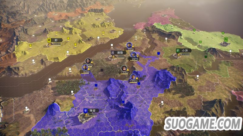本作中以一张地图真实重现宏大的中华大地,以美丽的CG描绘这些极具特色的区域。地区为土地的集合体,广大的1张地图中遍布46座都市,并划分成约340块地区;土地的争夺以互相涂上己方颜色呈现,让乍看复杂的战略要素变得更直觉,拓展领土的快感能以更精致、更自由的方式描写,思索如何扩展我军的颜色,朝统一大陆的目标迈进。