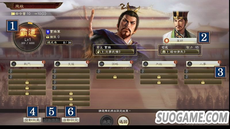 本作中可以组织「施政」,「施政」为势力之中枢,同时也是扩展玩家战略幅度的一大要素。「施政」以组织结构呈现,可以组织麾下武将并让势力获得各式各样的指令与效果。组织「施政」作为自己的战略是本作中相当重要的一环。