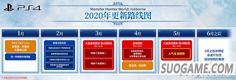 而PC版将于北京时间2月6日配信第一弹大型更新,追加新怪物金狮子、《生化2重制版》联动活动等一系列活动,3月12日追加新怪物狱狼龙以及冥赤龙相关活动任务,4月将达成与主机版同步更新。