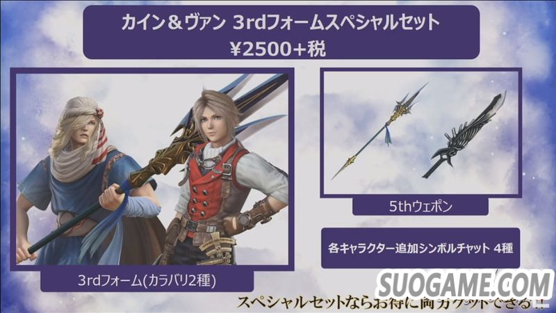 凯因的新服装取自《最终幻想4 月之归还》中的造型,而梵的新服装则是制作组原创的衣服,不过手中的新武器则是出自《最终幻想12》的“死亡使者”单手剑。跟之前一样,新DLC均拥有三种不同的配色。这些DLC将于北京时间2月6日登陆PS4与PC平台,单个新服装套装售价为1500日元/102港币,两个DLC打包购买的价格为2500日元/148港币。