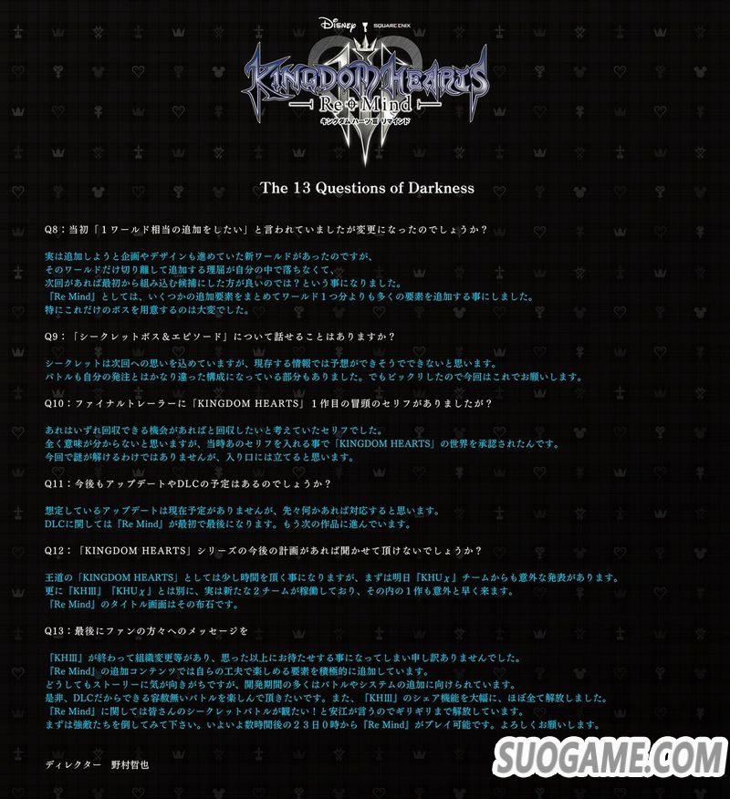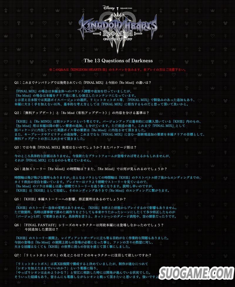 《王国之心3》在一份官方Q&A中表示:“Re Mind是最初也是最后的DLC,目前并没有推出“FINAL MIX”的计划。至于新的实体版假如游戏今后登陆新的平台时会考虑,不过那并不会成为“FINAL MIX”。至于系列的未来,距离下一部《王国之心》正传还有一段时间,《KHUx》明天将会有意外的发表,除了KH3和KHUx外还有2个新团队在工作,其中一个作品特别快就会到来。Re Mind的标题画面中有线索。”