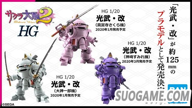 BANDAI SPIRITS公司此前曾发表过《樱花大战2》HG 1/20 光武?改的三款拼装模型,今日(2020年1月25日)真宫寺樱机和大神一郎机现已推出,高约12.5cm,含税价各3850日元。而神崎堇机预计将于北京时间今年3月发售。
