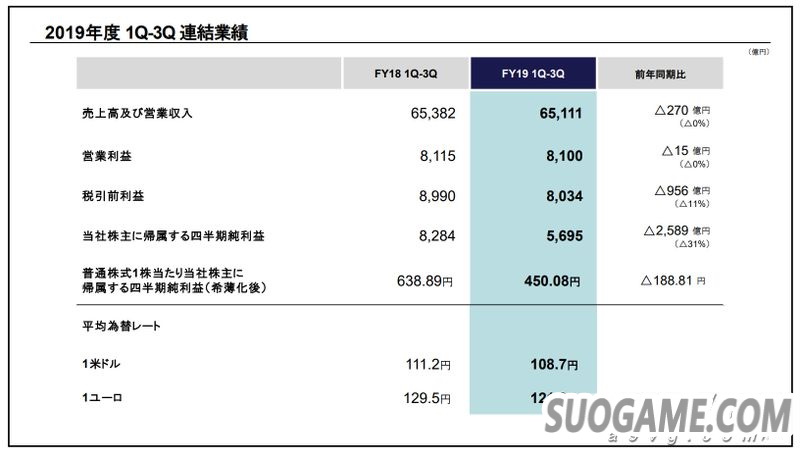 索尼公布19-20财年第三季度财报,财年累计(Q1-Q3)营业额为65111亿日元、营业利益8100亿日元,较去年同期基本持平。