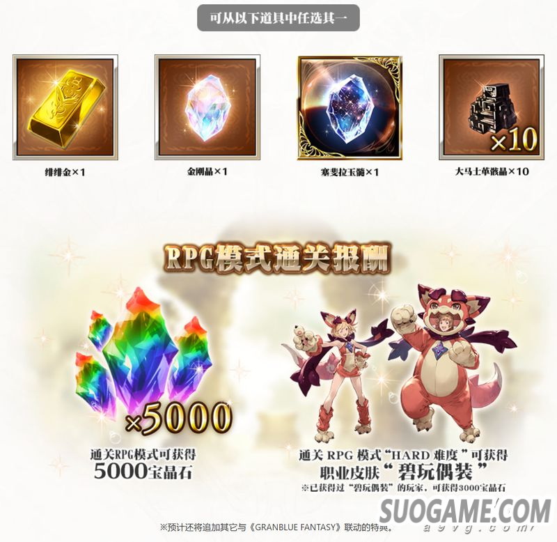 这个游戏附送了大量的《碧蓝幻想》原作道具特典,算上通关RPG模式困难难度,总计可获得稀有道具4选1(绯绯金、金刚晶、塞斐拉玉髓、大马士革骸晶x10)、5000钻、碧玩偶装或3000钻。合算一下市值比游戏本身的售价还高许多,所以每卖出一份《碧蓝幻想VERSUS》KMR(木村唯人,《碧蓝幻想》IP负责人)还要倒贴钱呢(笑)。