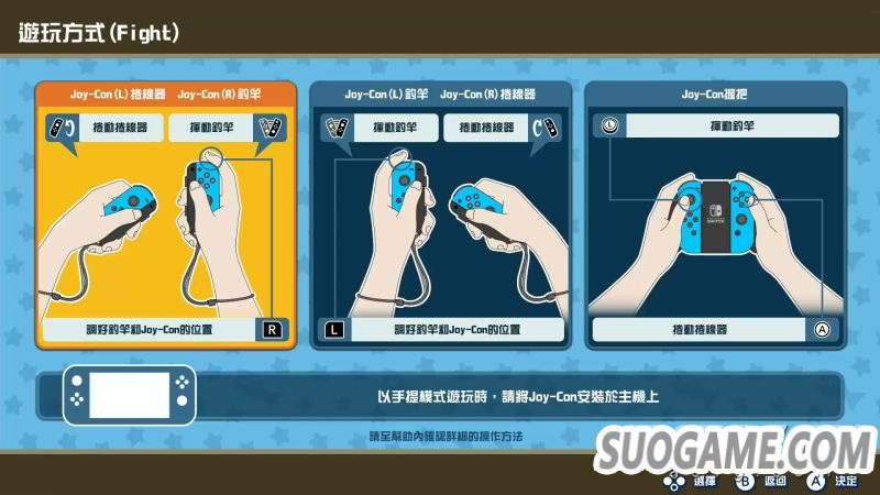 本作包含基本操作在内,充分活用Joy-Con的陀螺仪传感器,并根据玩家的操作方法,可以从叁种玩法中选择想要的方式。此外,本作中提供的迷你游戏还支持「Nintendo Labo」的「钓鱼Toy-Con」,让玩家可以更真实地体验钓鱼带来的乐趣。
