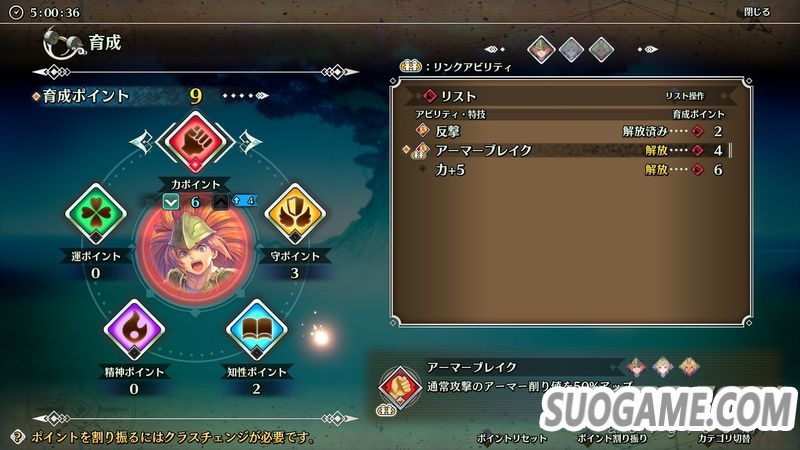 角色们随着等级提升,HP、力量等基本属性都会增长。同时升级时还会获得“培养点数”,可以用于获得特技、技能或是提升各种能力,而已经分配过的培养点数可以在某个地方进行重置。