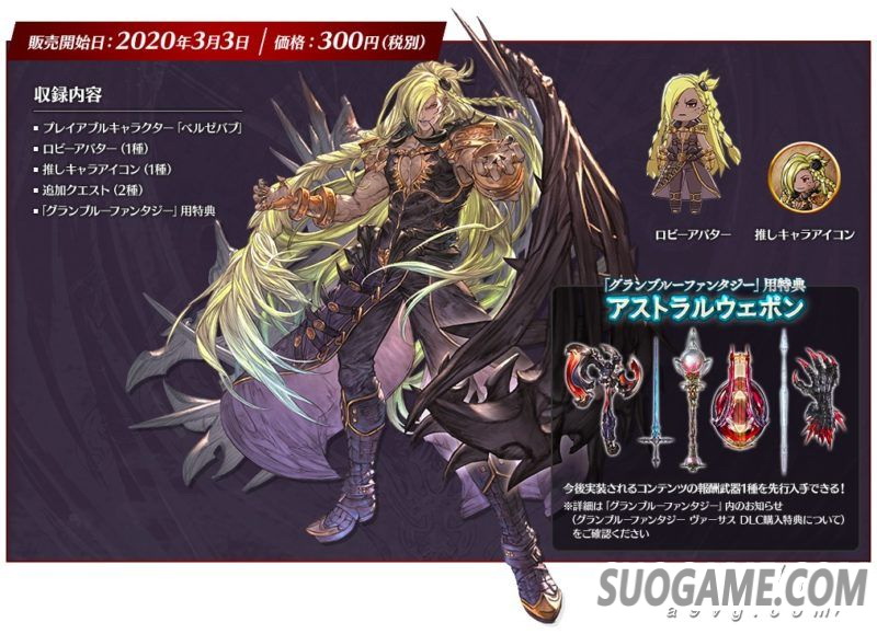Cygames公布PS4《碧蓝幻想VERSUS》第一弹DLC角色别西卜(最终BOSS)将于北京时间3月3日推出,并公开他的介绍影像。该DLC单独售价300日元,购买之后还可以获得《碧蓝幻想》中的武器兑换码。另外即使不购买DLC,3月3日更新后通关RPG模式也可以使用他。