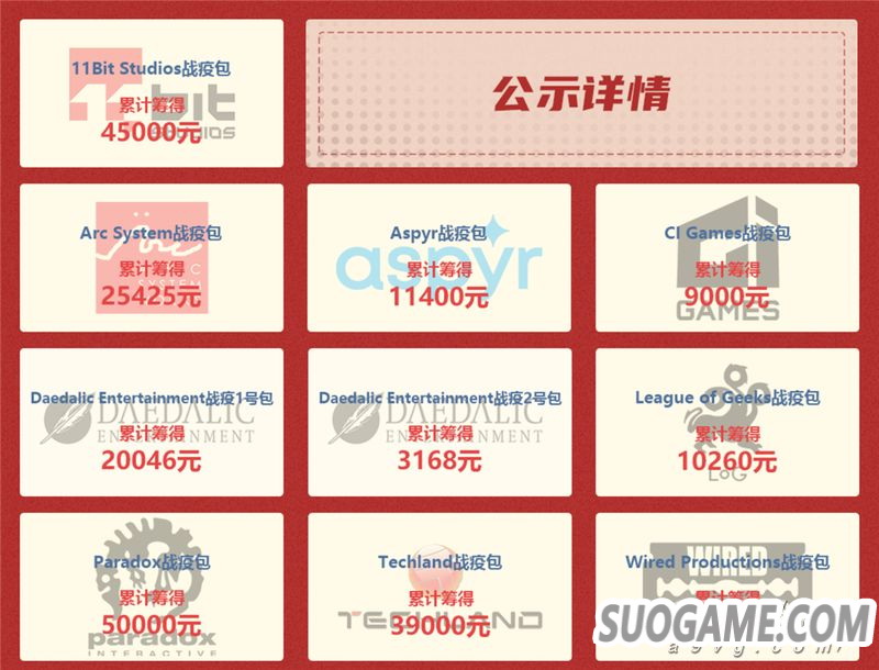 此次义卖活动中,杉果游戏共邀请到11 bit studios、Arc System Works、Aspyr、CI Games、Daedalic Entertainment、League of Geeks、Paradox、Techland和Wired Productions等9家海外合作伙伴参与。这9家游戏发行商为此次活动无偿提供了义卖游戏,促成了义卖活动的顺利举行,杉果游戏也向他们表示了由衷的感谢。9家合作伙伴捐赠游戏筹得款项数额已在杉果网站公示,详情如下图: