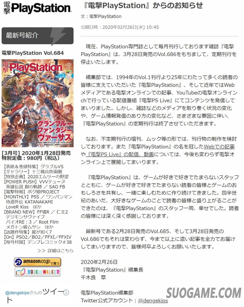 日本老牌游戏杂志《电击PlayStation》宣布自3月28日发售的第686期起停止定期出版,改为不定期推出。该杂志为1994年创立的以PlayStation相关内容为主的专门杂志,此前是半月刊,后改为月刊,本次改为不定期刊。