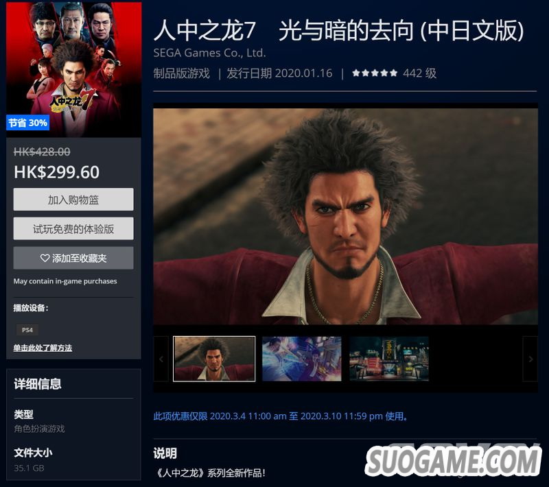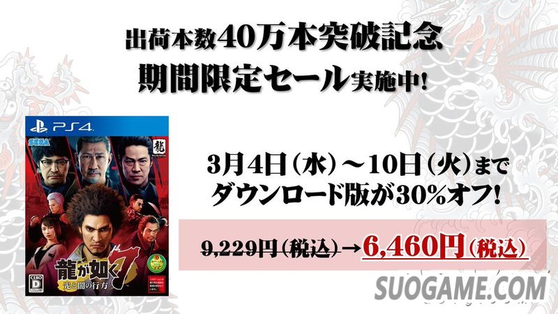 SEGA宣布为纪念PS4游戏《如龙7 光与暗的去向》在整个亚洲地区(含日本)累计出货量突破40万份,于今天(3月4日)至3月10日期间对游戏的下载版进行7折优惠促销。
