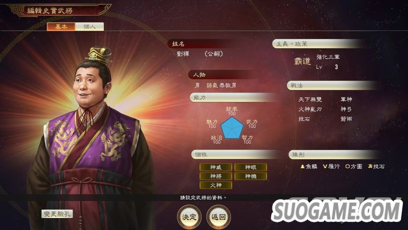 「史实武将编辑」为可自由编辑游戏内高达1,000名登场武将的能力、个性、战法、政策等信息的功能。玩家能够尽情自由编辑武将信息,像是私心将喜欢的武将变得更强,或是让武将个性变得更突出等。
