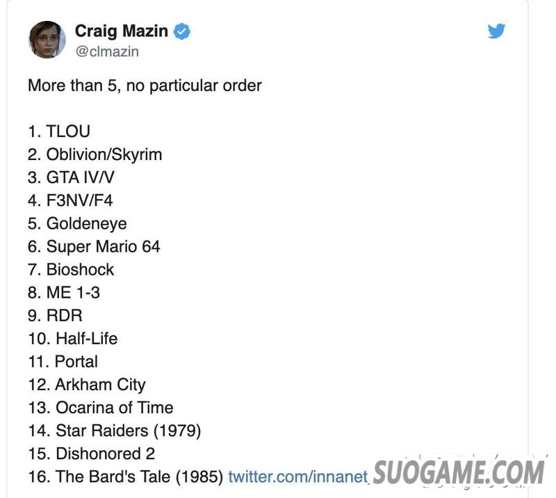 顽皮狗和HBO即将合作推出《最后生还者》电视剧,担任导演兼编剧的《切尔诺贝利》编剧Craig Mazin为了证明自己的玩家身份一口气列出了20款喜欢的游戏。