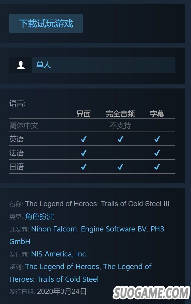 继Switch版后,PC(Steam)版的《英雄传说 闪之轨迹3》也推出了试玩版。这个Steam版由日本一发行,支持日语、英语、法语,不支持中文,预定于3月23日发售。