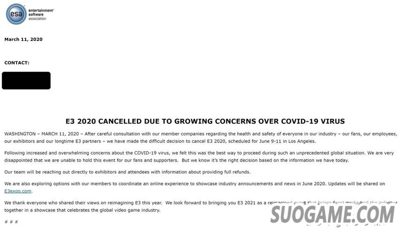 E3主办方ESA正式宣布,出于对旗下员工和行业相关人士健康的考虑,他们决定取消今年的E3 2020游戏大展。他们将和参与者取得联系,商讨全额退款事宜,并寻求举办线上活动的方法。