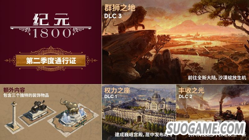 为庆祝《纪元1800》全球总玩家数突破100万,感谢玩家社区的积极反馈与支持,从3月12日19:00至3月16日22:00,玩家能够在Uplay平台免费探索《纪元1800》(包括等级1至等级3的游戏内容以及合作模式)。同时,《纪元1800》第二季度通行证现已推出,包含了游戏将于北京时间2020年推出的3部DLC:《权力之座》、《丰收之光》以及《群狮之地》。