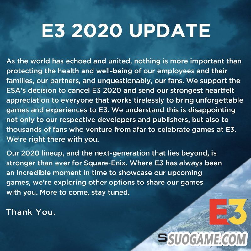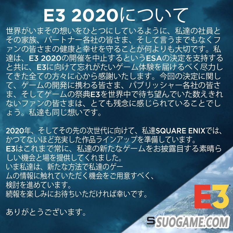 SQUARE ENIX发表公告表示为了大家的健康考虑支持ESA中止举办E3的决定。SE面向2020以及未来的次世代准备了前所未有的充实游戏阵容,目前他们正在考虑用新的方法让大家了解这些作品的情报。