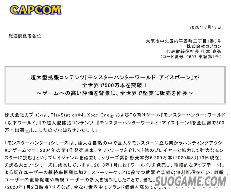 CAPCOM宣布截至3月13日《怪物猎人世界 Iceborne》全球出货突破500万份,《怪物猎人》系列累计销量突破6200万份。