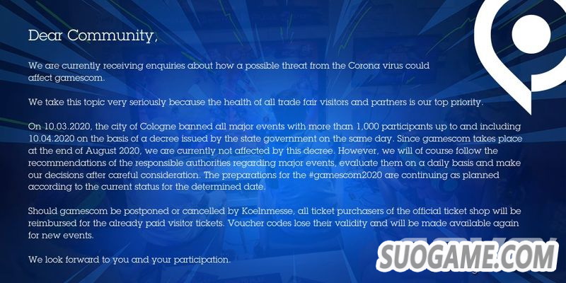 官方表示因为疫情的原因,科隆市内在3月10日就已经禁止了所有大型活动,而将于北京时间8月底举行gamescon展会暂时不受禁令影响。但举办方会遵从有关部门的建议并在考虑过后做出相应的决定,倘若因为疫情的关系导致展会延期或取消,他们保证会进行退票,超过兑换期限的兑换码也将为新展会重新设置期限。
