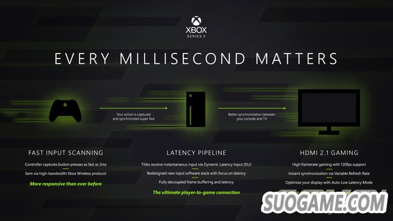 对速度的另一项定义就是“低延迟”,动态延迟输入(DLI、自动低延迟模式(VRR)和可变刷新率等技术,加上HDMI 2.1和同诸多电视厂商的合作,使得整个生态系统已经为Xbox Series X的到来做好了准备。
