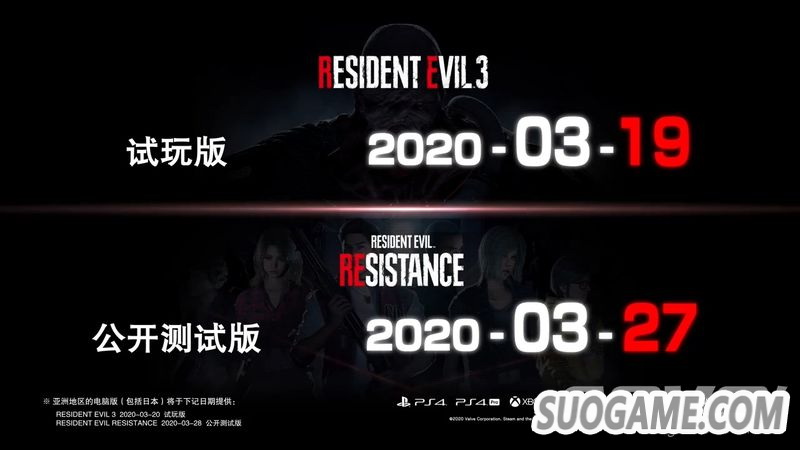 亚洲这边(含中文版)具体安排是3月19日推出PS4/Xbox One版《生化危机3 重制版》的DEMO,3月27日推出PS4/Xbox One版“抵抗”的公测,而PC(Steam)版晚一天,分别于3月20日和3月28日推出。