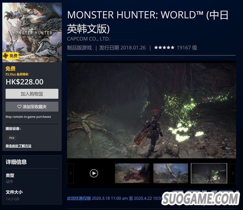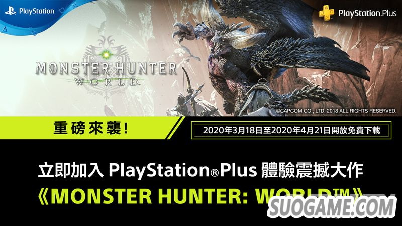 港服、日服等各地区PS商店突然将《怪物猎人世界》标记为PS+会员免费游戏,可领取时期为3月18日至4月22日。(更新:随后官方正式发布预告片宣传本次会免活动)
