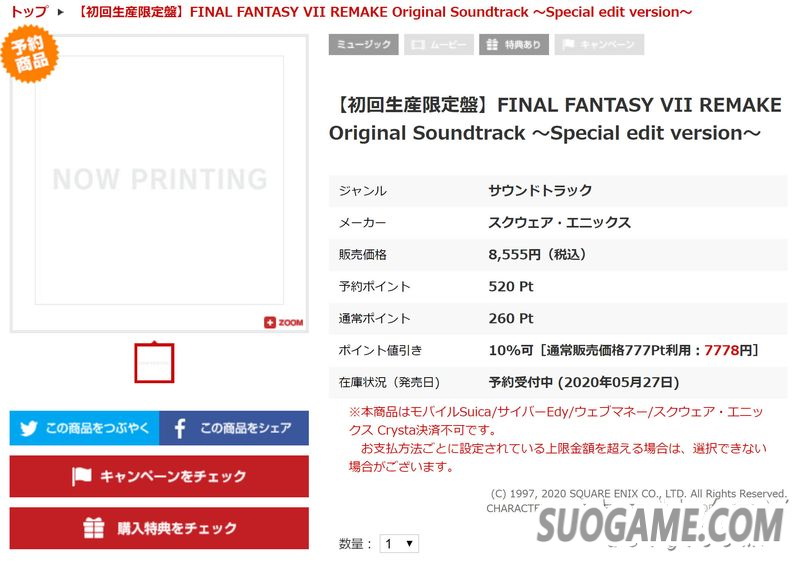 SE宣布《最终幻想7 重制版》的原声音乐CD将于北京时间5月27日发售,普通/限定版定价7150/8555日元。专辑将收录包含植松伸夫创作的全新主题曲「Hollow」在内的乐曲,高达7张CD的容量,而限定版还会附带游戏内音乐盒中乐曲的特典盘,首发购买则可以获得迷你记事本。