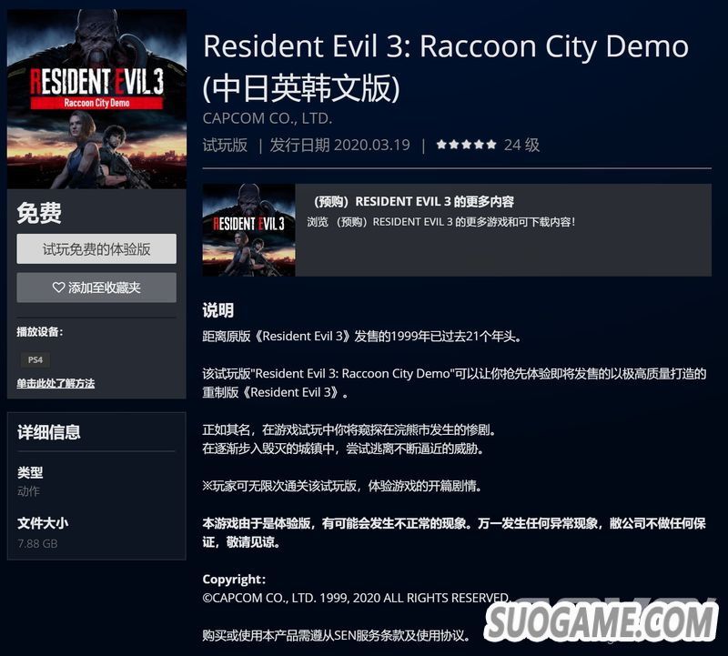 《生化危机3 重制版》的DEMO体验版已在PS4、Xbox One平台各个服上架,而PC版将于晚些时候推出。