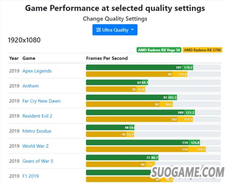 “计算单元(CU)”可以看做是GPU用来进行计算的微型CPU集群,CU越多,GPU的性能也就越强。说到PS5和XSX在GPU上的差别,这个数据其实比浮点性能更能说明问题,PS5基本相当于Radeon RX 5700显卡,而XSX则相当于Radeon RX Vega 56显卡。以下是这两款显卡在运行不同游戏时的帧数表现: