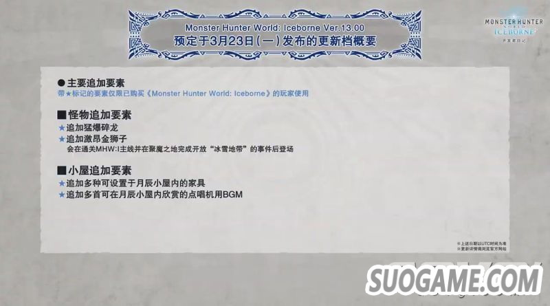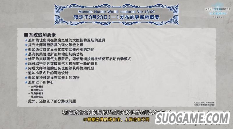 《怪物猎人世界 Iceborne》3月23日更新重点内容,将针对游戏内容和聚魔之地进行调整。
