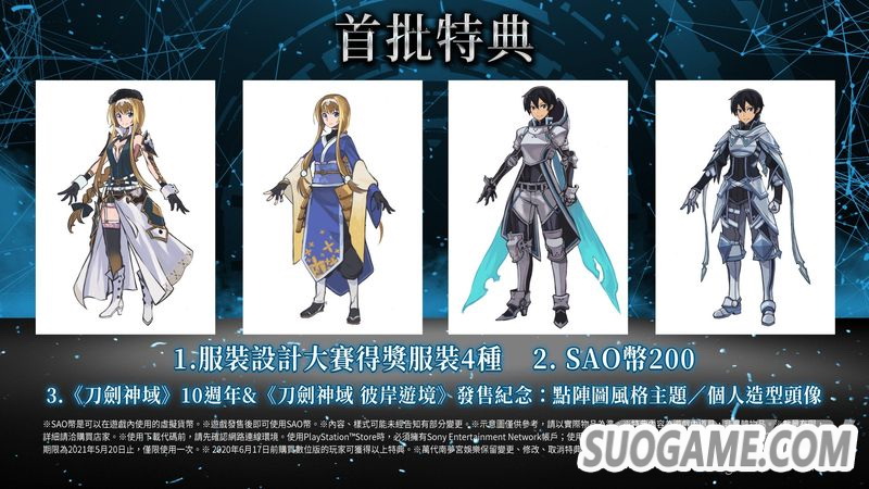 凡购买首批实体《刀剑神域彼岸游境》繁体中文版将可获得以下特典:
