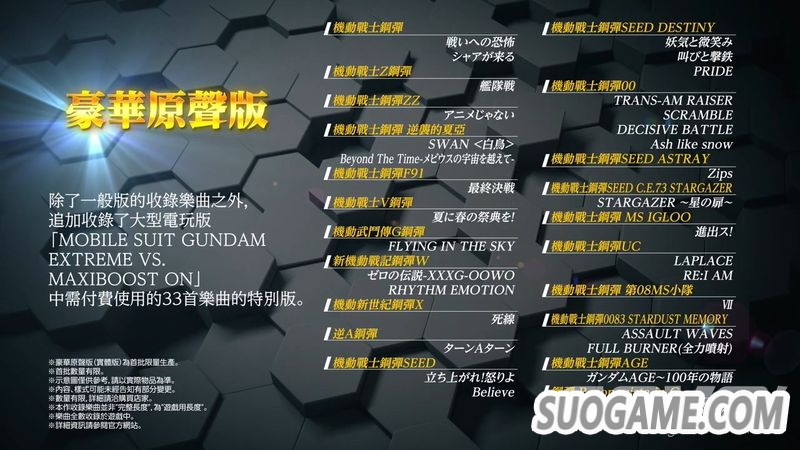 「豪华原声版」为除了一般版的收录乐曲之外,追加收录了大型电玩版「MOBILE SUIT GUNDAM EXTREME VS. MAXIBOOST ON」中需付费使用的33首乐曲的特别版。