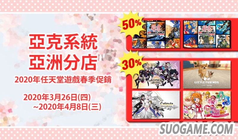 亚克系统(ARC SYSTEM WORKS)亚洲分店宣布,上市于Nintendo Switch?平台的《彩京精选 Vol.2》《小小伙伴 -狗狗&猫猫-》《卡里古拉·过量强化 Caligula Overdose》等6款游戏将从明天3月26日(四)至4月8日(三)进行为期2周的春季促销。