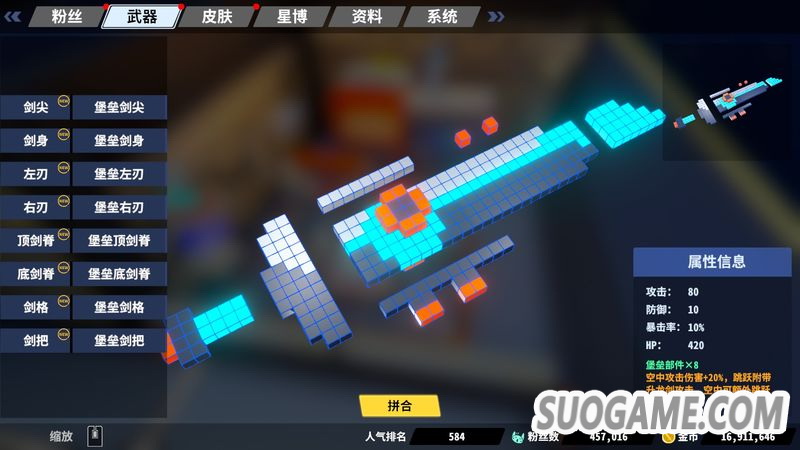 在《星际角斗场》中,有数十套配件可供玩家选择,这些配件可以形成上千种组合,充分发挥你的DIY才能来打造最适合你的武器。而随着战斗的进展,你还能自定义体素方块打造一把专属的武器。