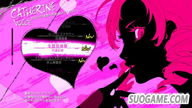 女主角之一的 Catherine 以文森特心中理想的姿态出现在他面前,而语音的部分则可由玩家依照自己的喜好来进行变更。
