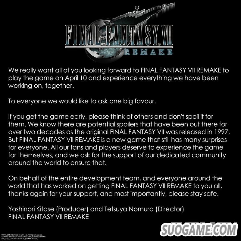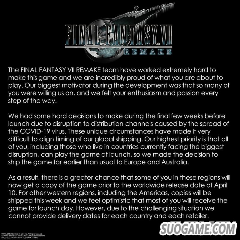 SE今天在推特上表示,为了使《最终幻想7 重制版》能部分疫情严重的地区也能于4月10日如期发售,他们已经提前将实体游戏发往了欧洲和澳大利亚。美国等西方国家则会在本周开始出货,基本能保证准时发售。尽管这是款有20多年历史的经典游戏,但《重制版》里还是有特别多惊喜的,所以希望早于发售日拿到游戏的玩家们不要剧透。