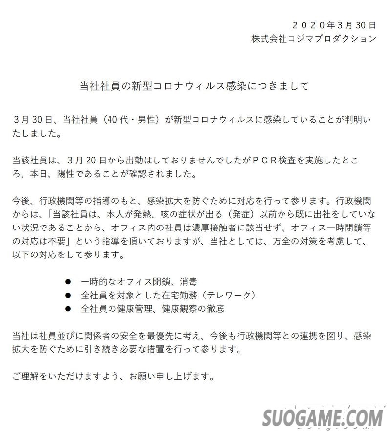 虽然日本防疫部门表示“因为该社员在身体不适之前就没来上班,所以办公室内并无密切接触者。可以不用关闭办公室。”不过小岛工作室还是决定暂时关闭工作室消毒,并要求所有员工在家办公并彻底管理健康状况。