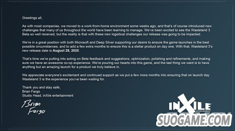 另外今日开发商inXile也发布声明表示《废土3》因为开发团队因疫情改为在家办公,为保证游戏质量选择了延期。新发售日为8月28日,游戏将登陆PS4、Xbox One与PC平台。