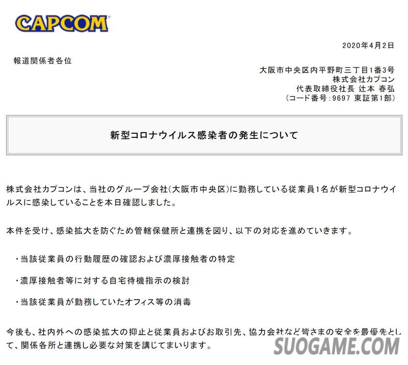 CAPCOM公布该社集团公司一名从业人员确诊为新冠病毒肺炎。目前公司正在调查该社员的行动历史和密切接触者,并让密切接触者在自家隔离,此外还对办公室进行消毒。