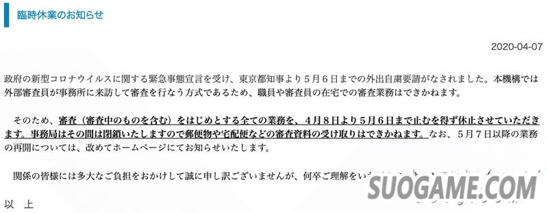 因为日本刚刚发表“紧急事态宣言”,日本游戏审查机构CERO宣布临时停业1个月,游戏审查完全停止。