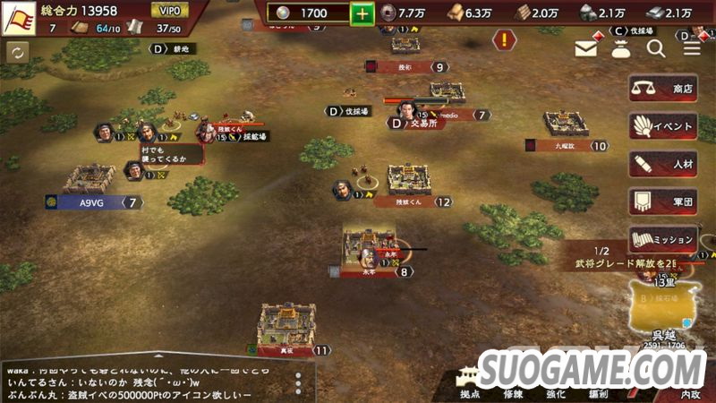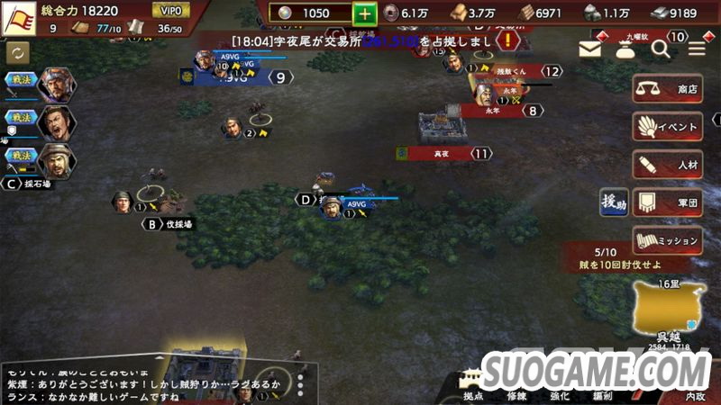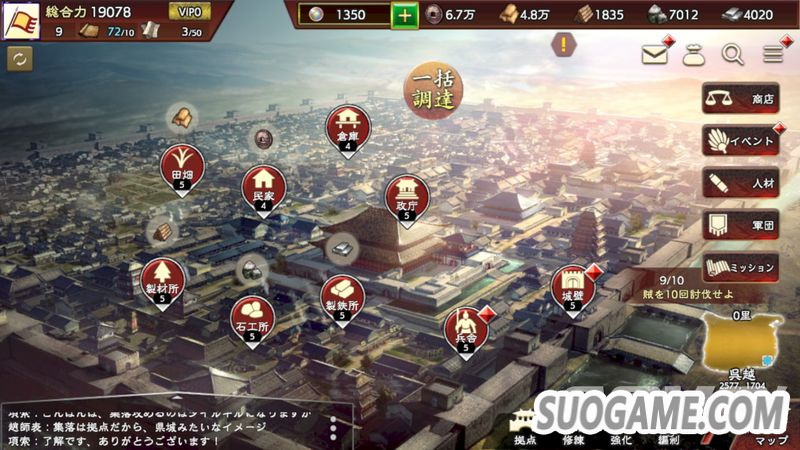玩家可以在大地图上对战斗编队下达指令,外出行动则需要耗费命令书。前期可以讨伐一下周围的山贼练练级,后期则可以直接攻打其它玩家。另外在地图上还有特别多采集点,可以派遣部队前往获取资源,采集需要部队一直驻扎,并且完事还需要运送回来,因此过程中是有可能被其它玩家打劫的。