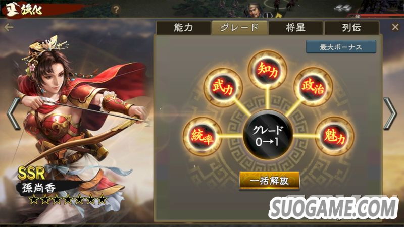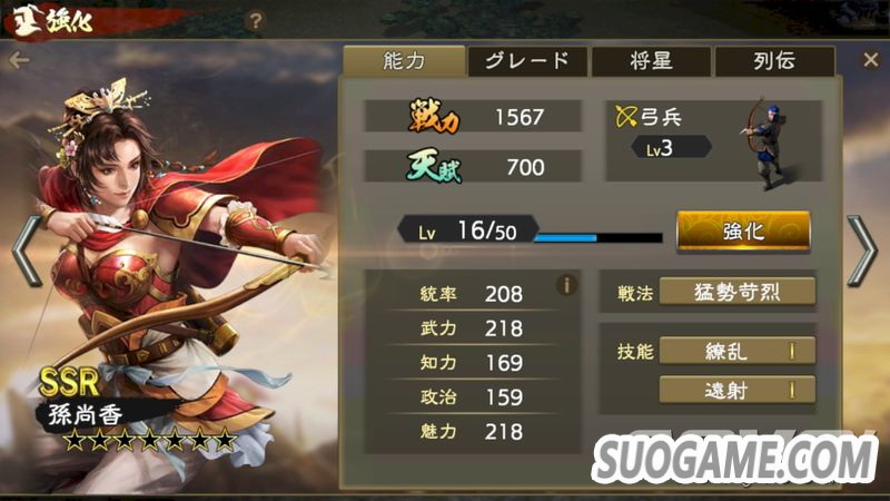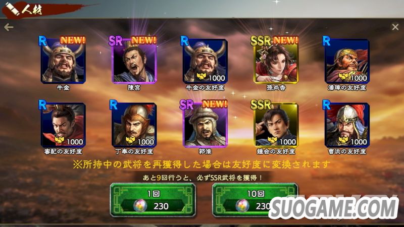 “求人”就是手游比较常见的抽卡,这个游戏抽卡还比较良心,SSR出率为2%,10连就能保底一个SSR,所以SSR的获取并不算太困难。抽到相同武将的话则会转为好感度,这个会在后面详述。