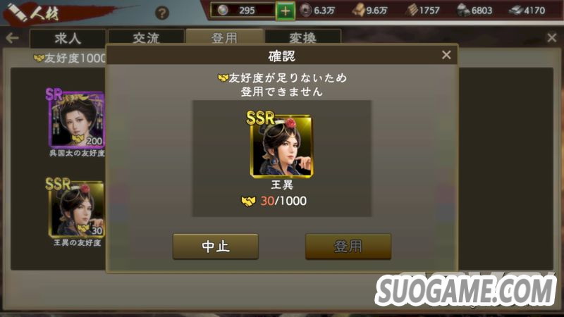 “登用”就是指直接获取特定的武将,包含SSR武将要在内都可以获得。平时通过“交流”可以积累与特定武将之间的好感度,当好感度达到一定程度就可以直接登用该武将。按照内测版的设定运气好的话几天就能凑够好感。
