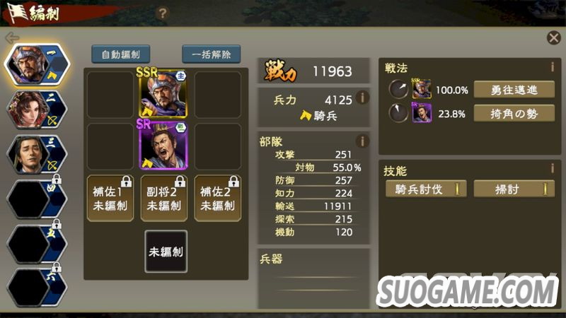 游戏中每个武将都有独特的战法和技能,兵种和基本能力也各有不同,如何搭配武将也是游戏的策略玩法之一。战斗编队由主将、两名副将、两名辅佐和兵器构成,会随玩家等级逐步开放,兵种以及战法技能搭配会显得十分重要。