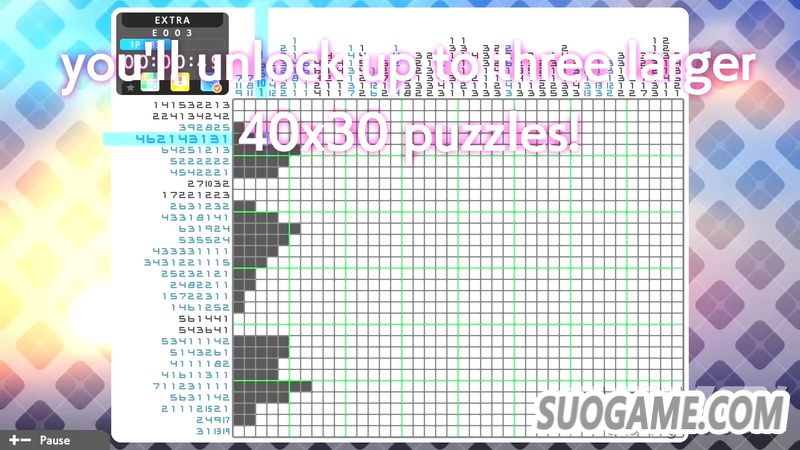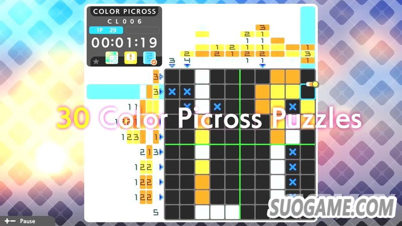 在S4中将有4个模式可以游玩,光是Picross模式和Mega Picross模式就有300道问题。Color Picross模式有30道问题、Clip Picross模式有150道问题可以游玩。并且最后在Extra中还有2道30×30的大盘面绘图可以游玩。如果在Switch平台购买了《绘图方块》系列的前作的话,还可以通过存档联动,在Extra模式额外游玩最多3道40×30的大盘面绘图。